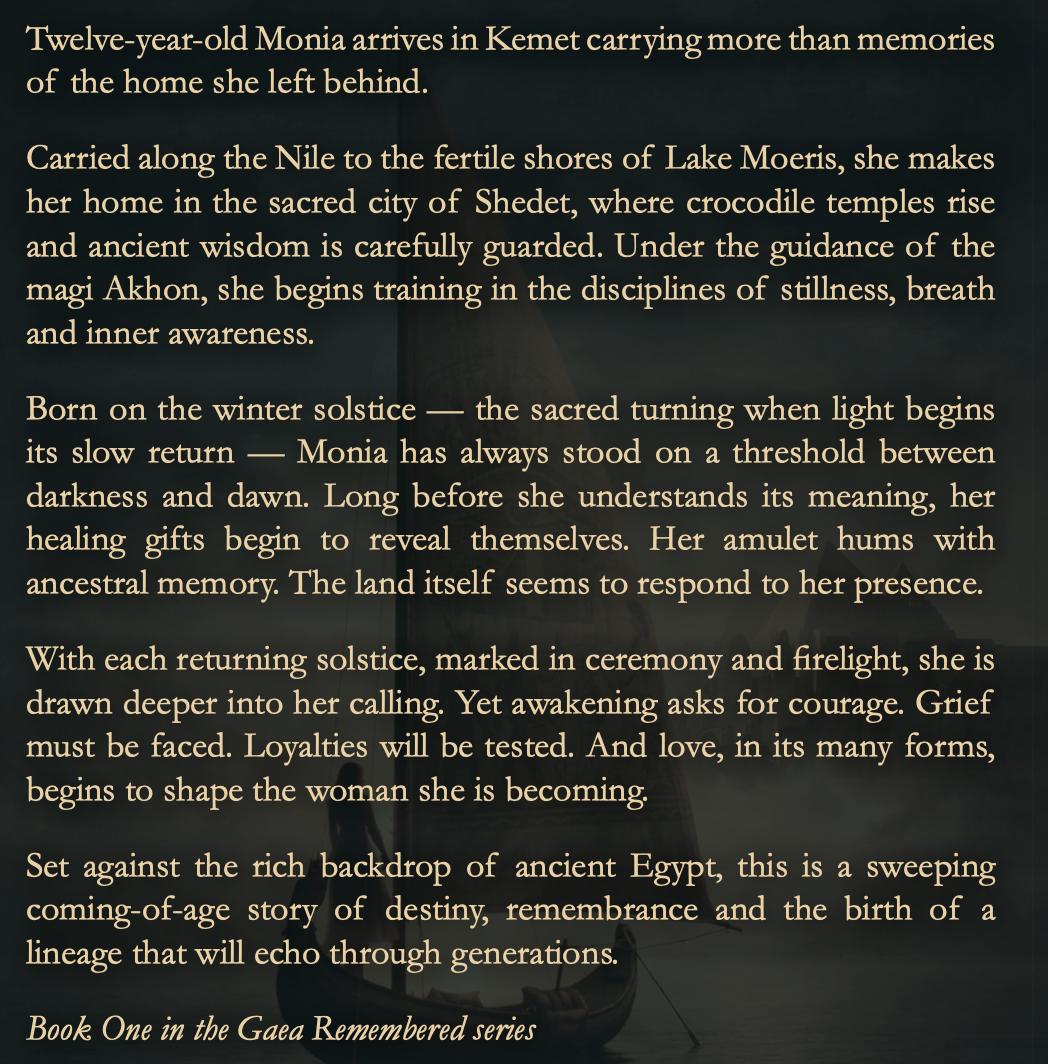 In Daughter of the Solstice she arrives in Kemet as a grieving twelve year old, forced to leave behind everything she has known. She carries gifts she does not yet understand, and an ancestry she has not yet been taught to remember.